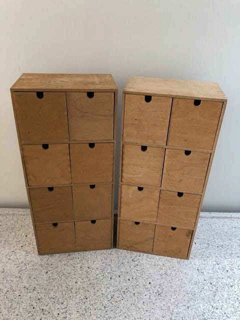 2 små skabe med skuffe.