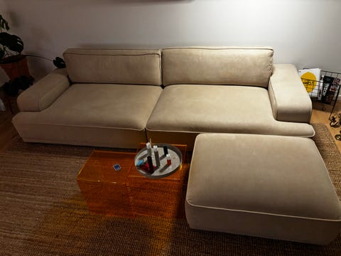 Beige velour sofa med chaiselong.