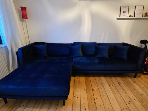 Blå velour sofa med chaiselong