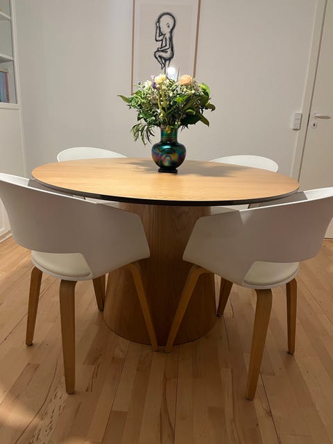 Fritz Hansen Arne Jacobsen stol træ med sort lædder hyndesæde og rund spisebord