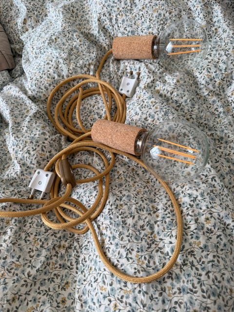 Trælampe med lys og en stofledning