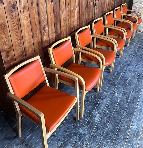 7 stk. Schou Andersen designer kvalitetsstole med hjul – flot retro-orange