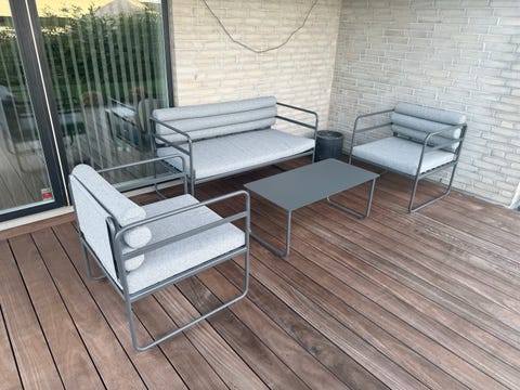 Havemøbelsæt med sofa, 2 stole og bord i grå metal