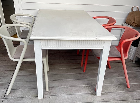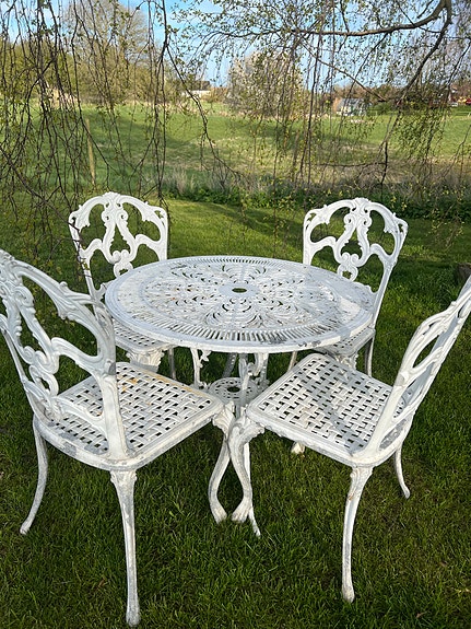 Hvidt rundt havemøbelsæt i metal med 4 stole