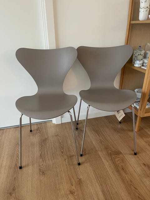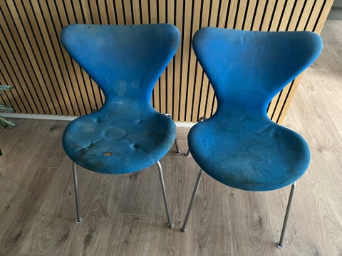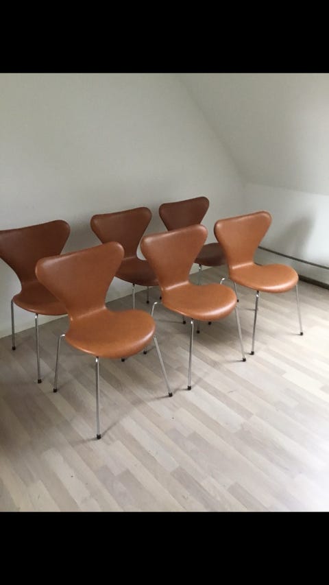 6 stk syver stole 3107, nypolstret i cognac semianilin læder. Sædehøjde 44,5 cm.