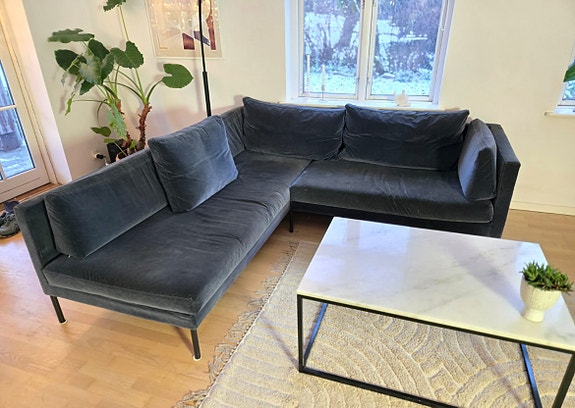 Blå velour sofa med chaiselong