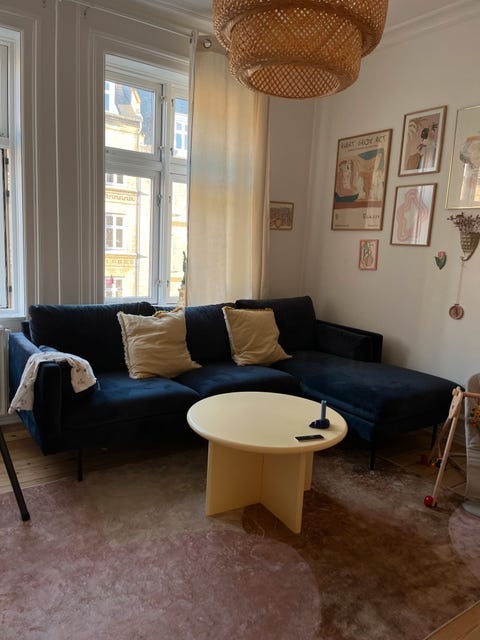 Stor blå veloursofa med chaiselong